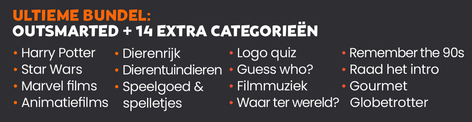 De meeste traditionele bordspellen bevatten ongeveer 1.000 vragen. Outsmarted! wordt standaard geleverd met 7.000+ vragen. EN uniek in een bordspel... de vragen bevatten veelal geweldige afbeeldingen, muziekclips of video's!!
